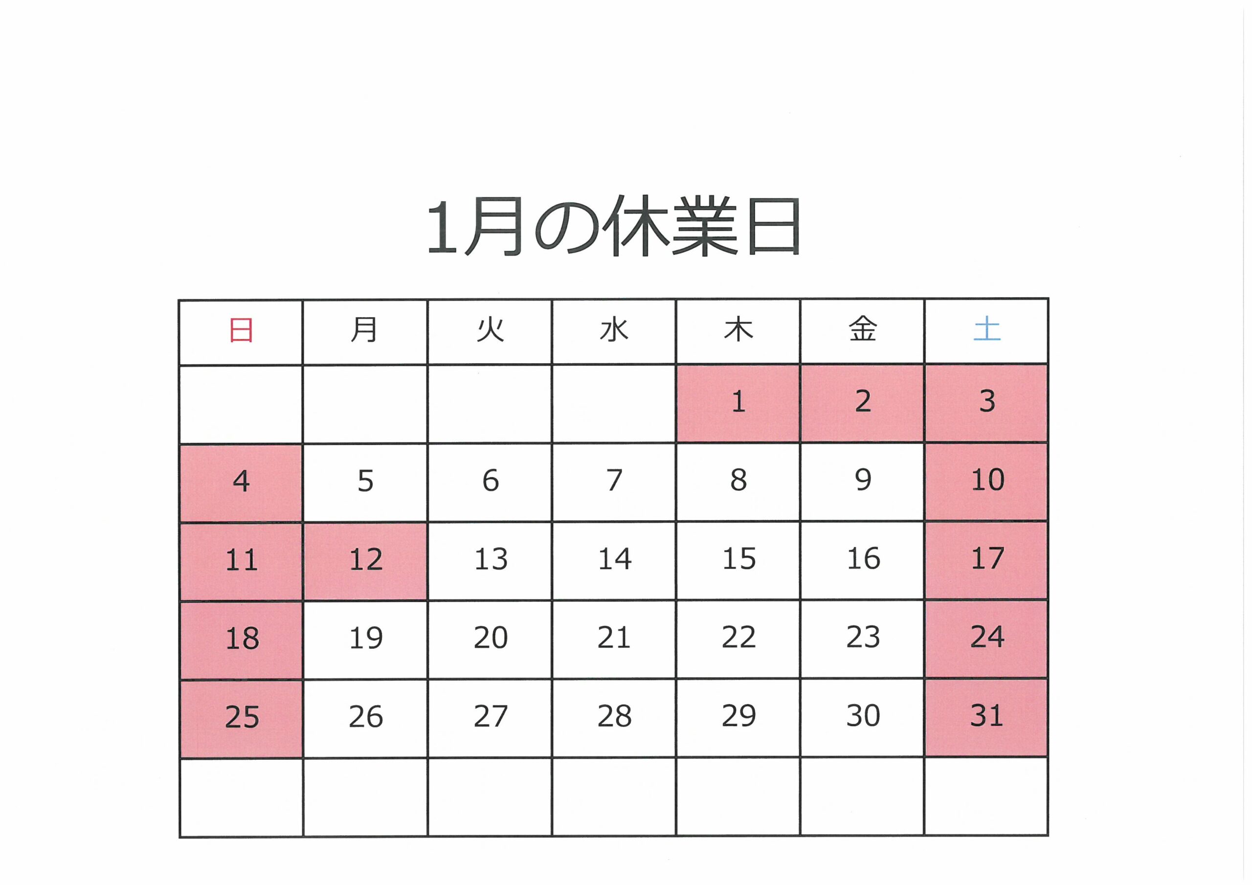 1月1日(木)~4日(日)、1月10日(土)~12日(月)、1月17日(土)、1月24日(土)、1月31日(土)は当社指定休日により休業とさせていただきます。