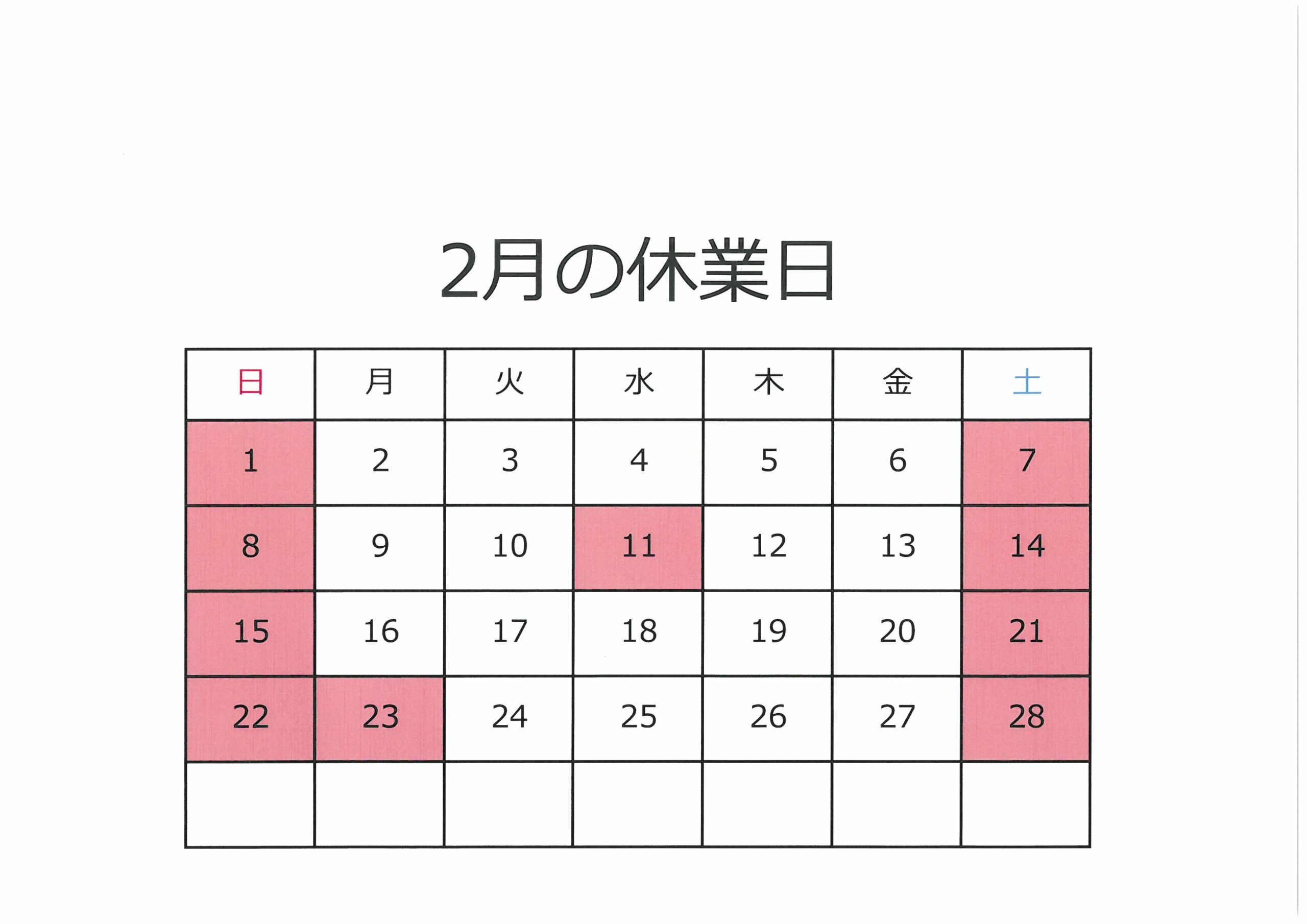 2月7日(土)、2月11日(水)、2月14日(土)、2月21日(土)、2月23日(月)、2月28日(土)は当社指定休日により休業とさせていただきます。
