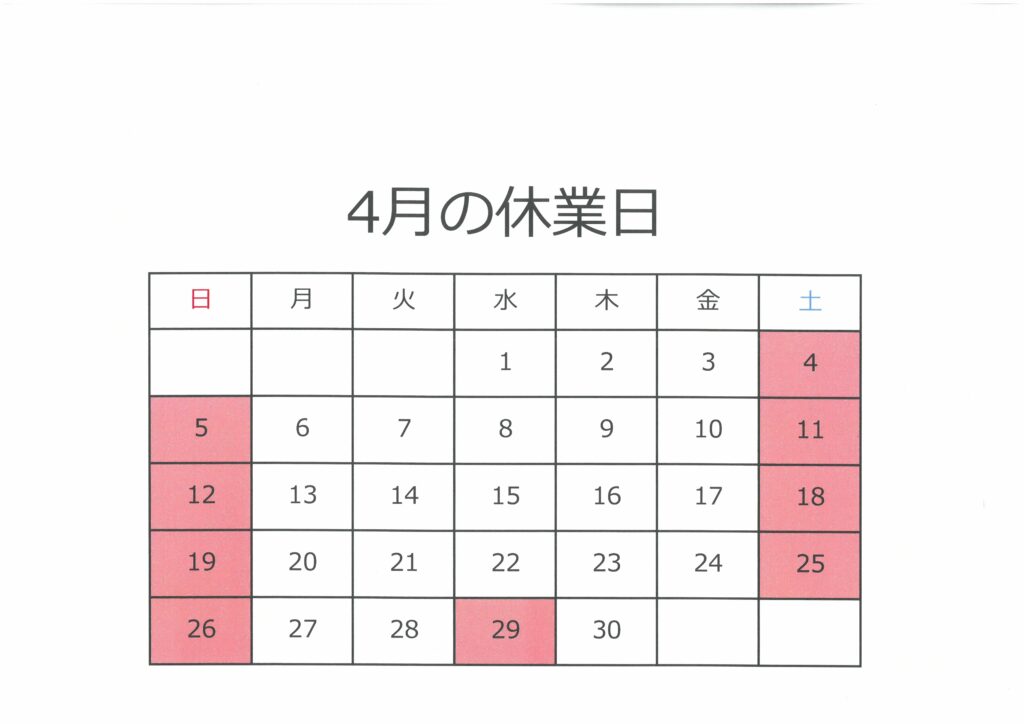 4月4日(土)、4月11日(土)、4月18日(土)、4月25日(土)、4月29日(水)は当社指定休日により休業とさせていただきます。
